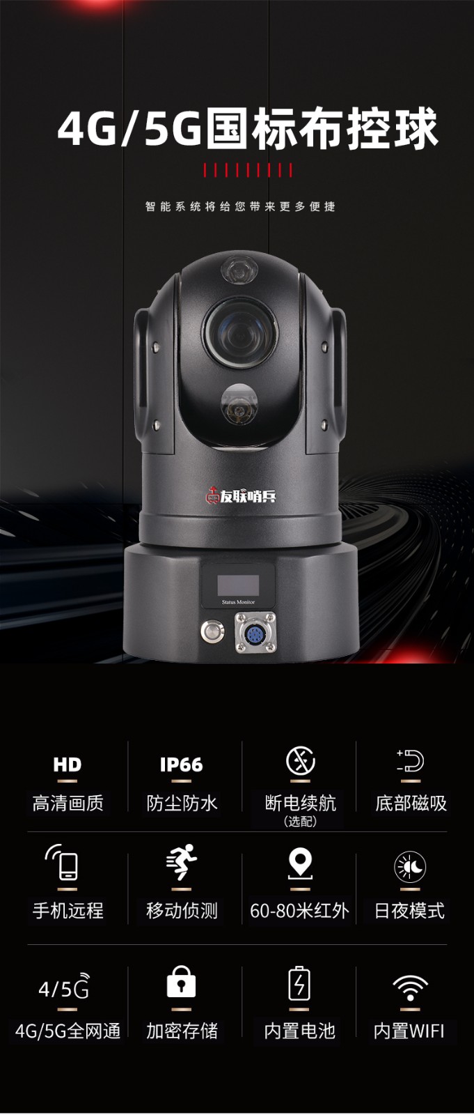 友聯(lián)哨兵4G高清布控球是一款功能全面、攜帶方便的無(wú)線視頻4G應(yīng)急布控球產(chǎn)品,超高設(shè)備集成度,內(nèi)置高性能鋰電池組,具備防水防震的特性,可滿足臨時(shí)布控和快速安裝的特殊要求。